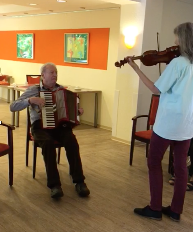 Frau S. wünscht meist keinen Besuch. Umso erstaunter war ich, wie positiv sie auf Frau Feierabends Geigenklänge reagierte: Sie strahlte und sang sogar mit! Als ich das der Tochter erzählte, entgegnete sie mit ungläubigem Staunen: "Meine Mutter?!?"