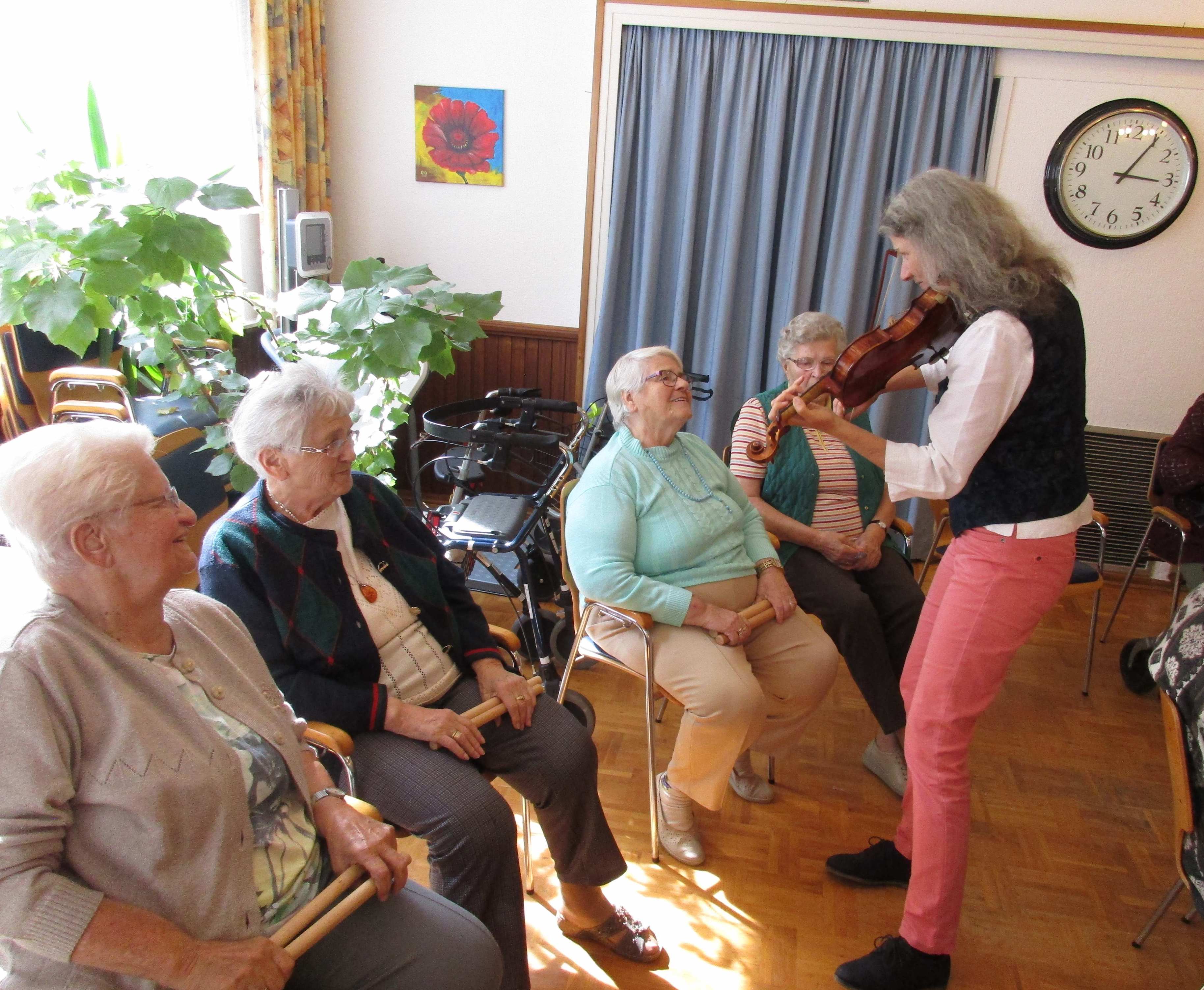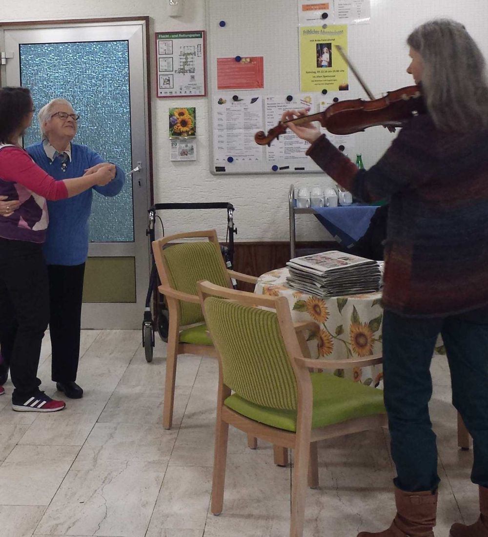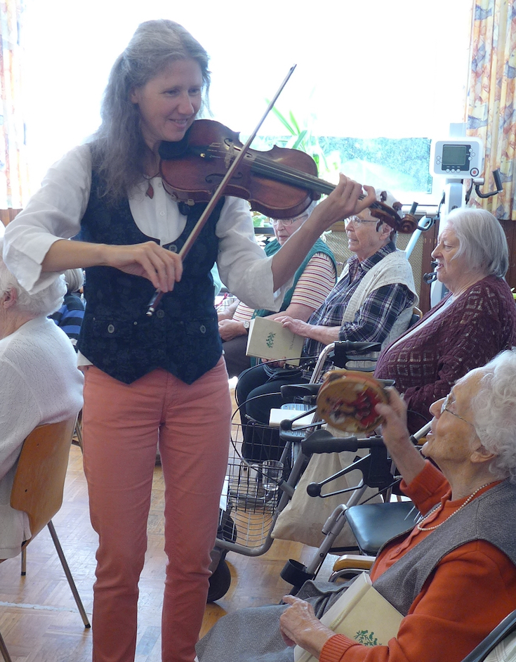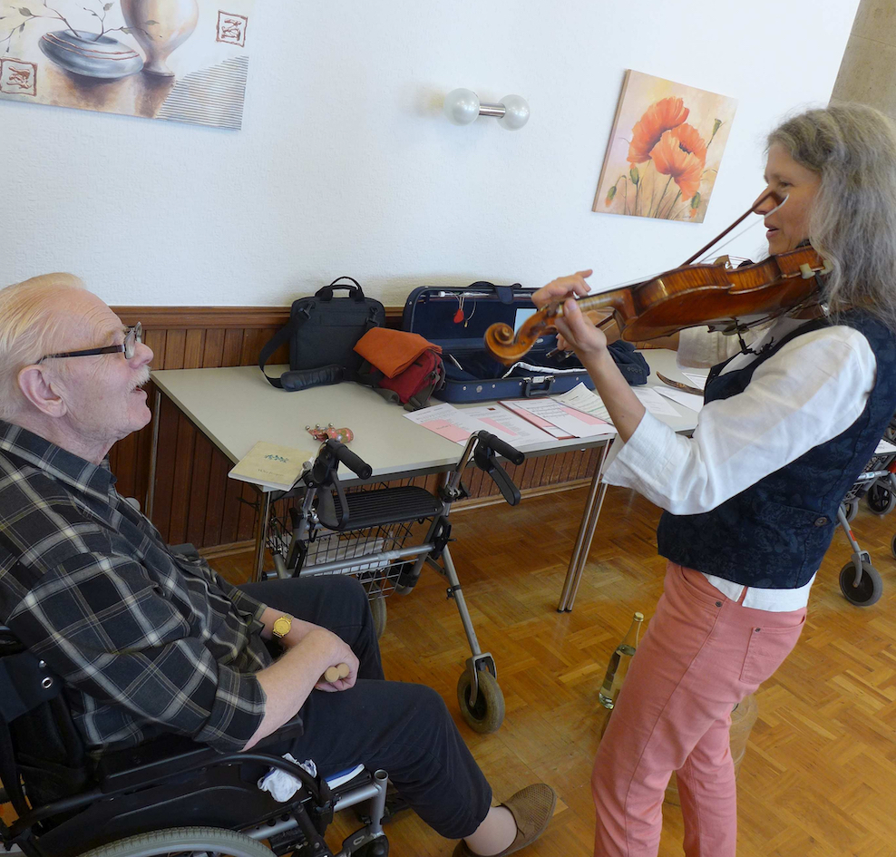 Der klare, warme, tragende Ton meiner Violine bietet eine gute Orientierung und erleichtert den alten Menschen das Mitsingen. Dabei achte ich darauf, jedes Stück in einer Tonlage zu spielen, in der gut mitgesungen werden kann.