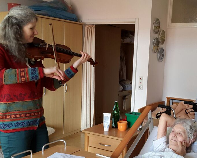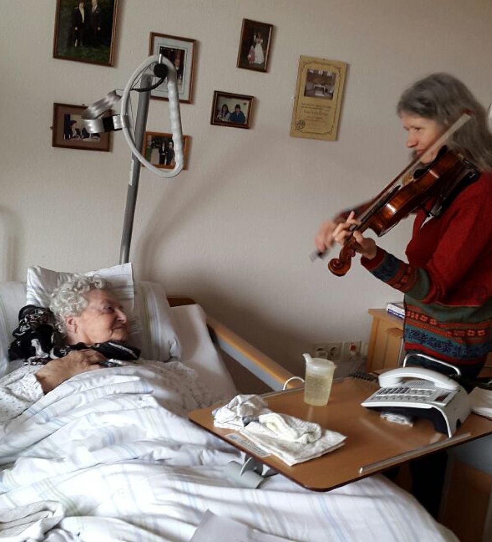 Frau S. wünscht meist keinen Besuch. Umso erstaunter war ich, wie positiv sie auf Frau Feierabends Geigenklänge reagierte: Sie strahlte und sang sogar mit! Als ich das der Tochter erzählte, entgegnete sie mit ungläubigem Staunen: "Meine Mutter?!?"